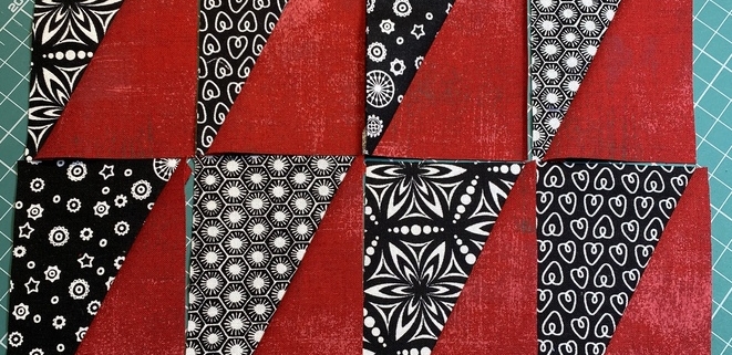 We kennen allemaal de HST: de half square triangles. Makkelijk te maken en ze worden veelvuldig gebruikt. De half rectangle triangle ziet er ongeveer hetzelfde uit, maar is net even lastiger te maken. Je kunt namelijk niet zomaar twee rechthoeken op elkaar leggen, aan weerszijden van de middellijn naaien en dan doormidden snijden.