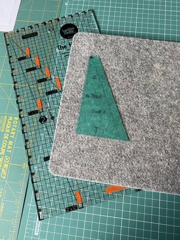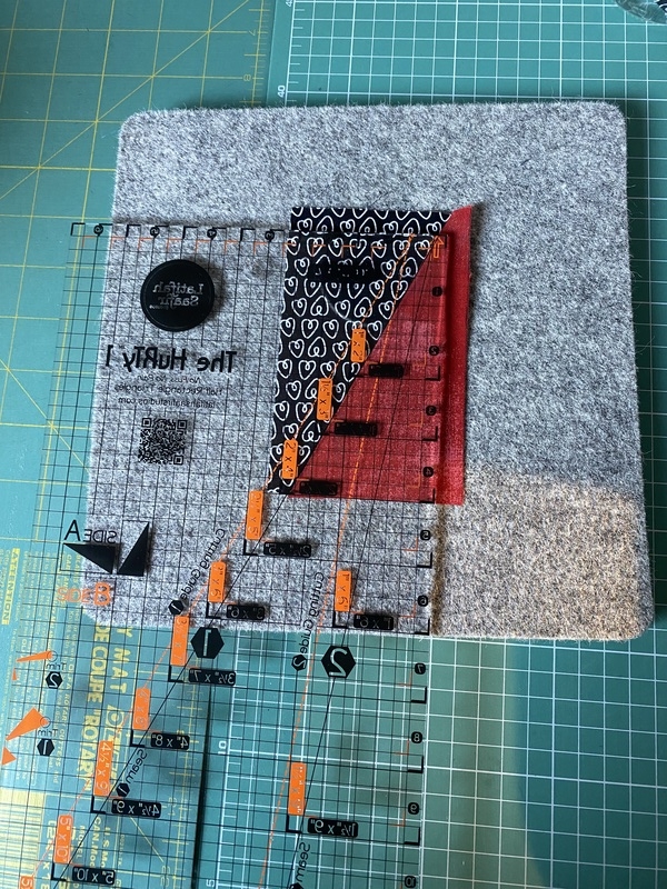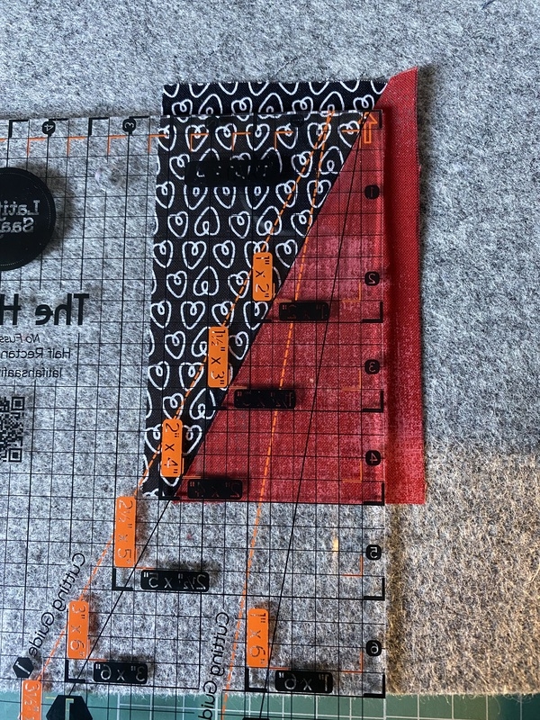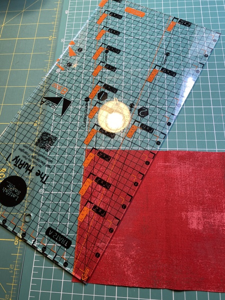 Ik gebruik de speciale liniaal om de rechthoek in de juiste maat te snijden. Op de liniaal is een lijn aangebracht, die ervoor zorgt dat er aan weerskanten van de diagonaal een kwart inch naadtoeslag overblijft. En dat moet ik hebben!