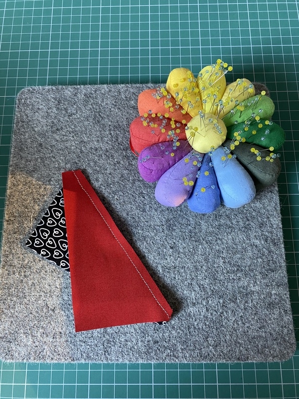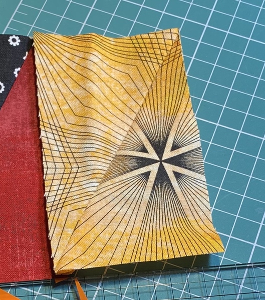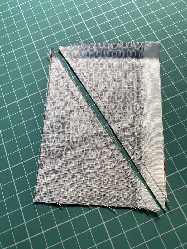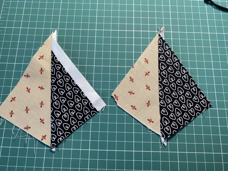 Als ik een paar driehoeken heb gesneden, snij’ ik nog even een paar hoekjes af om een en ander goed op elkaar te kunnen leggen en naai 2 driehoeken aan elkaar. Dan is heel goed te zien, wat het grote verschil is met de half square triangles.