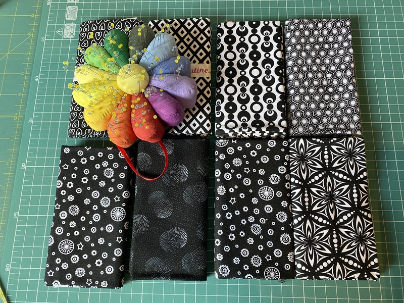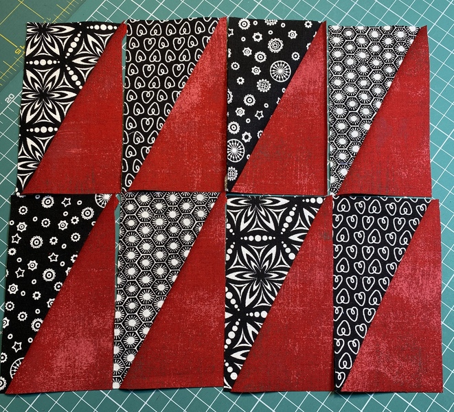Ik heb zwart-witte stofjes uitgekozen om te combineren met het rood. Ik begin met het snijden van stroken van 5”.