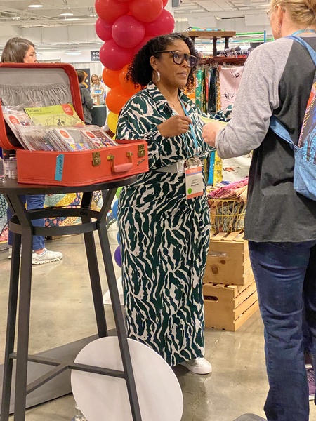 Deze liniaal stond vorig jaar op mijn boodschappenlijstje, toen ik naar Quiltcon in de Verenigde Staten ging. Tot mijn grote teleurstelling was de liniaal al uitverkocht bij de winkel, waar ik hem gepland had te kopen. Maar soms is dat een geluk bij een ongeluk. Bij een andere winkel was de liniaal niet alleen voorradig, hij werd mij door Latifah Saafir zelf verkocht! Een van de leuke aspecten van zo’n reisje, is dat je beroemde quilters ‘in het wild’ kunt tegenkomen. We maakten een gezellig praatje en ze wenste mij veel plezier met de liniaal. Aardig mens!