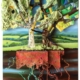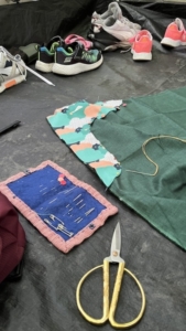 We gingen een week op pad, op de fiets van camping naar camping. Dat betekende dat alle overbodig spullen thuis moesten blijven. Toch wilde ik het op een of andere manier vastleggen. Ik koos ervoor om het compleet anders te doen dan normaal: Ik nam een lap stof van 55×55 cm mee als ondergrond, een paar kleinere lapjes om erop te naaien, een paar kleuren draad en natuurlijk naaigerei. Dat nam nog eens weinig plek in!