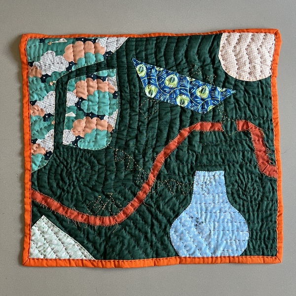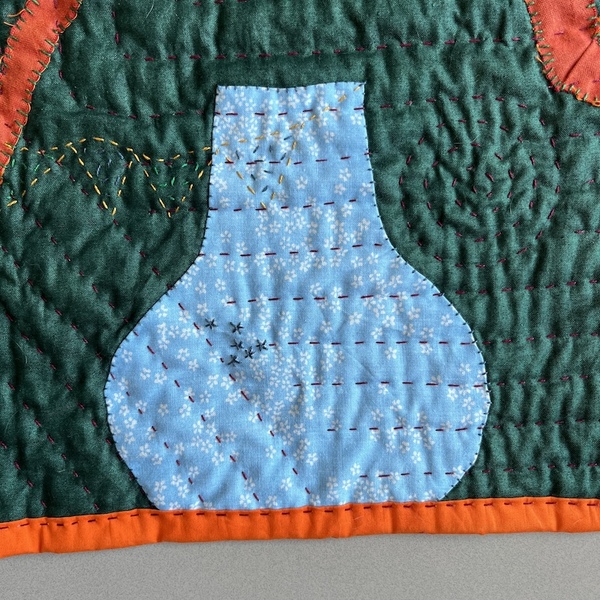 Elke avond in de tent dacht ik terug aan wat we die dag deden en vertaalde dat in iets voor op de lap. Soms heel letterlijk (een fiets op een pad), soms abstracter (de vele wolken en de regen die er soms uitkwam). Soms met een stukje stof, soms alleen door steken te borduren (de vlaggetjes voor de verjaardag van manlief). Ik vond het prettig dat ik mezelf beperkt had in de hoeveelheid materialen, dat gaf veel rust! Ik moest het doen met wat ik had meegenomen, dus ik had geen keuzestress. Helemaal toevallig had ik een stukje blauw met witte stof mee, wat perfect was voor een bezoekje aan Royal Delft! Eenmaal thuis was het leuk om alles met de hand te quilten en zo de vakantie nóg een keer te beleven.