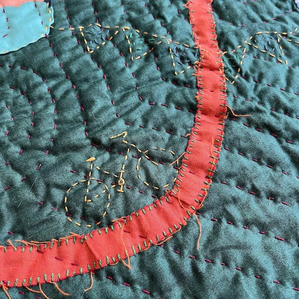 We gingen een week op pad, op de fiets van camping naar camping. Dat betekende dat alle overbodig spullen thuis moesten blijven. Toch wilde ik het op een of andere manier vastleggen. Ik koos ervoor om het compleet anders te doen dan normaal: Ik nam een lap stof van 55×55 cm mee als ondergrond, een paar kleinere lapjes om erop te naaien, een paar kleuren draad en natuurlijk naaigerei. Dat nam nog eens weinig plek in!