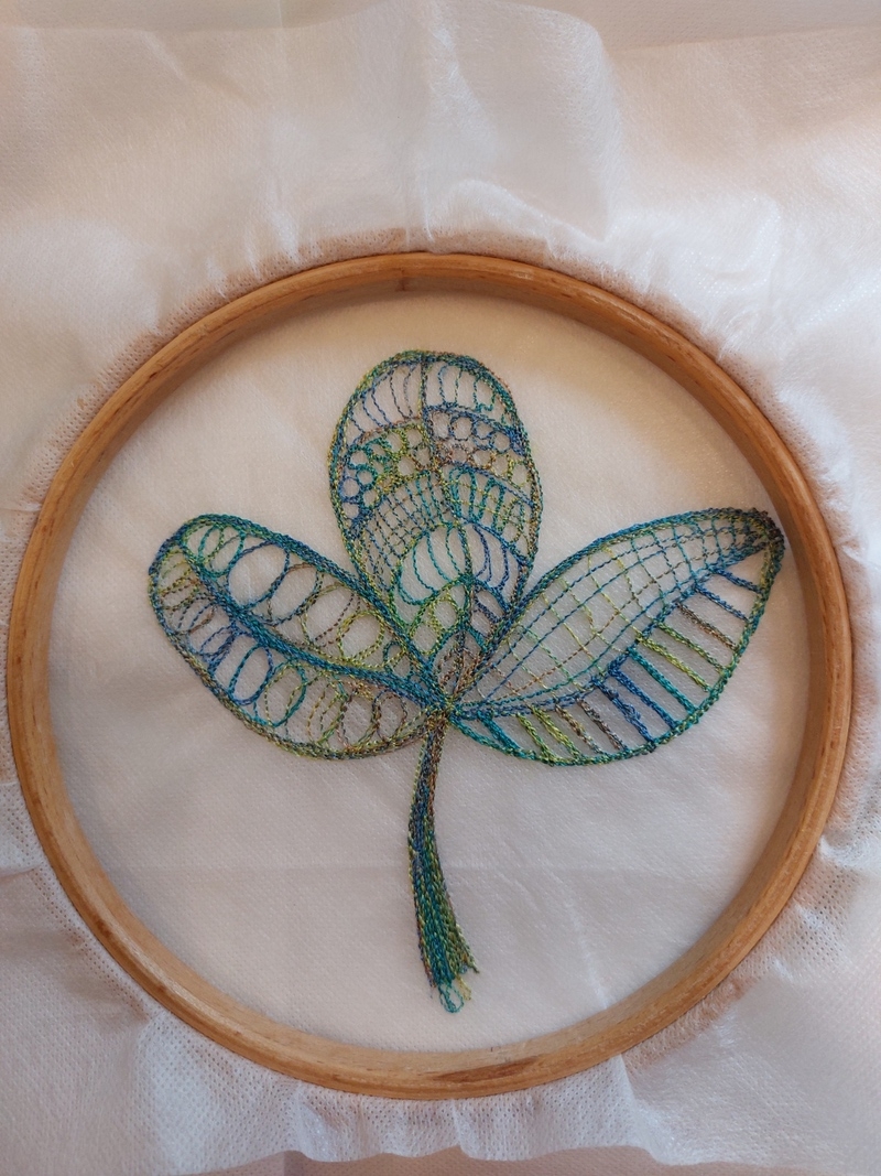 Het was de bedoeling dat je proefjes ging stikken met b.v. rondjes of rechte lijnen die elkaar steeds kruisen om het verband in het werk te houden. Want waar het niet aan- of over elkaar gestikt zit valt het tijdens het wegspoelen van het vlies uit elkaar en dat is uiteraard niet de bedoeling.