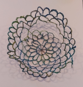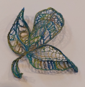 Om er voor mezelf wat uitdaging in te houden koos ik daarom voor het maken van blaadjes met gevarieerde invulling en een multicolor garen. Tijdens het uitspoelen bleef het zoals ik het had bedoeld dus ook dat leek ik redelijk onder controle te hebben. Ik heb het blaadje na het uitspoelen licht gekruld laten drogen. Best leuk gelukt.