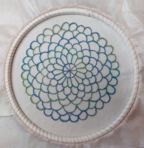 Toen het hele patroon was gestikt heb ik het geheel tegen het licht gehouden (tip van de juf) en ik was tevreden, het zag er goed uit. Uitspoelen dus.