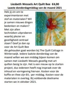 Met dat in mijn achterhoofd heb ik in overleg met de Quilt Cottage in Winterswijk een idee voor een Art Quilt Bee opgezet. Ik wilde dit niet thuis starten, ik wilde graag leunen op de mogelijkheden van een winkel met meer voorzieningen. Zou daar wel interesse voor zijn ???