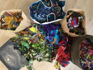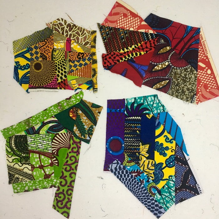 Ineens bedenk ik mij dat ik op dit soort momenten het beste de 15 Minutes of Play technique van Victoria Findlay Wolfe kan gaan doen, gewoon gaan spelen met alle scraps die ik van andere projecten over heb. Minstens 15 minuten lang stukjes stof aan elkaar naaien en op die manier ‘nieuwe stof’ maken. Als ik dan een aantal van dit soort nieuwe stofjes gemaakt heb kan ik daar een nieuwe vorm uit snijden. In de afgelopen jaren heb ik heel wat restjes stof verzameld en de meeste heb ik op kleur bij elkaar gedaan. Tijdens het uitzoeken en aan elkaar naaien van de stukjes stof krijg ik ineens een idee wat ik met deze stukjes kan gaan doen!