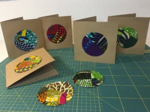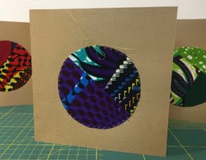 Met behulp van een beker teken ik rondjes op Vliesofix, een soort vlieseline die dubbelzijdig plakt. Deze knip ik uit en strijk ze op de achterkant van mijn nieuwe stofjes. Daarna strijk ik de ballen op de kaarten die ik voor Kerst al in huis had gehaald. De stof zit nu mooi vast op het dunne karton maar ik wil er ook nog een beetje meer glans aangeven. Gelukkig heb ik nog een klosje met gouddraad liggen en met de applique-steek naai ik het op het karton vast. De begin en einddraad zijn expres een beetje lang gehouden en zo kan ik er een strik van maken.
