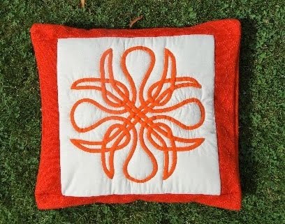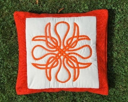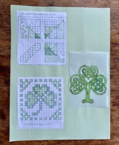Google afbeeldingen St. Patrick quilt patterns. Daar zie je dat veel patronen zijn gebaseerd op de kleur groen en een vierkantje. Echter de hoed, het klavertje, de clamshell, de Irish Chain of de Keltische Knoop zijn andere vormen/technieken die je kunnen gaan inspireren. Ook de Keltische Knoop heb ik al eens verwerkt in een tulpmotief in de kleur oranje voor de expositie Bloem 2018 (kussen Keltische Knoop -Tulp, 2018).