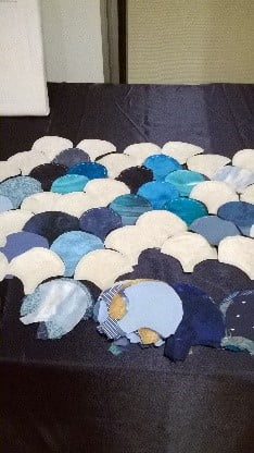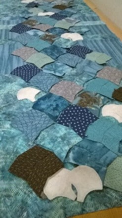 In 2017 voor expositie ‘De Kust’ heb ik de clamshell en een patroon uit Jessica Alexandrakis boek Quilten met de hand, pag.92 gebruikt. Dat laatste patroon bestaat uit twee ruiten die aan twee vierkanten worden gezet. Eindeloos veel golven heb ik zo gemaakt via de ‘Engelse’ methode (stof om kartonnen mal spannen en zo delen met de hand aaneenzetten). Mijn eigen blauw/groene zee-quilt als herinnering aan al die vakanties aan de Franse kust is zo ontstaan.