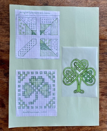 Kijk bij St. Patrick’s Day quilt Block tutorial voor video’s met uitleg voor quilts waarin het klavertje wordt gebruikt of de Lucky Knot in rechthoeken en vierkanten in de speciale kleur groen. Via quiltinspiration.blogspot.com>free pattern day: St. Patrick’s Day- Quiltinspiration, maar ook via Pinterest Free Pattern: St.Patrick’s Day|Celtic, Irish quilt, Free quilting- kom je op heel veel verwerkingsmogelijkheden.