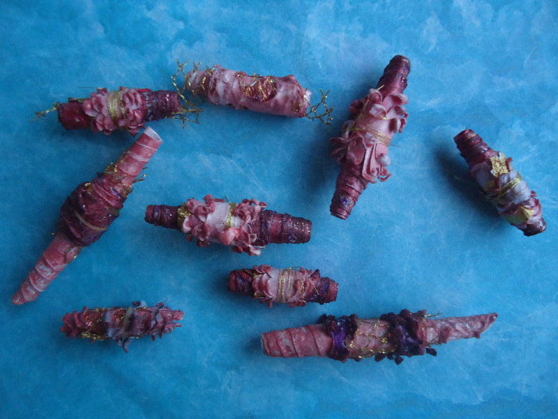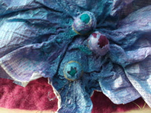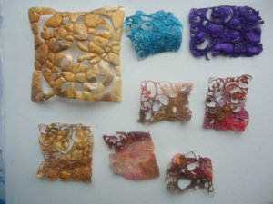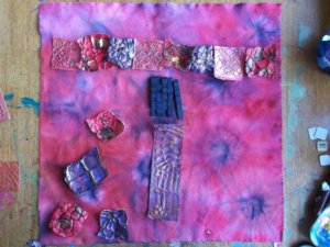 Maar 17 februari ging de cursus van start. Ik heb gekozen om via een blog te werken omdat niet iedereen op Facebook zit en een (besloten) blog kan iedereen met een Google account volgen. En omdat het heel leuk is als cursisten ook onderling kunnen communiceren is er ook een (geheime) facebookpagina waar ze elkaar en mij de resultaten kunnen laten zien. Ik ben nu twee weken verder en het is echt een ideale combinatie. Leuk om terug te horen hoe enthousiast iedereen is en om te zien wat ze allemaal doen. De meest vreemde creaties komen voorbij. Ik had materiaalpakketjes gemaakt, want nu de winkels dicht waren kun je niet alles zomaar kopen. En b.v. een stukje organza of pailletten via internet kopen, dan ben je meer aan verzendkosten kwijt dan de organza of de pailletten kosten.