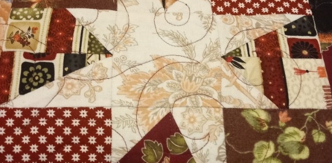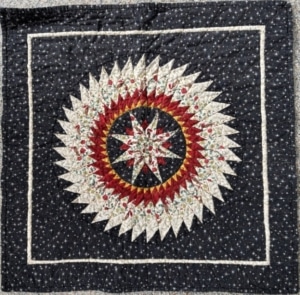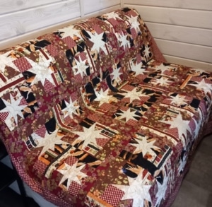 Yvonne maakte wel een kerstquilt waarbij ze opmerkte dat dit de eerste en ook enige is. Ze maakte haar ‘ronde, stralende ster’ jaren geleden in Amersfoort bij Laura Strating. Kleine zilveren sterren schitteren op een zwarte achtergrond. In de punten zijn kerststofjes verwerkt met hulsttakjes en roodborstjes. Het werk is gemaakt door stroken aan elkaar te naaien en die onder een hoek te versnijden en verspringend aan elkaar te zetten. De cirkel werd op de machine met gouddraad doorgestikt. Dit geeft het effect van stralen. De quilt is inmiddels oud en verschoten van kleur maar het blijft een van Yvonne’s favorieten. De tweede quilt die Pauline ooit maakte, gebruikt zij als kerstquilt. Het was destijds een hele goede oefening om puntjes te leren naaien. De inspiratie haalde ze uit een tijdschrift met alleen sterrenpatronen. De quilt ligt over de slaapbank te wachten op de logees die met kerst komen.