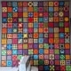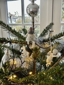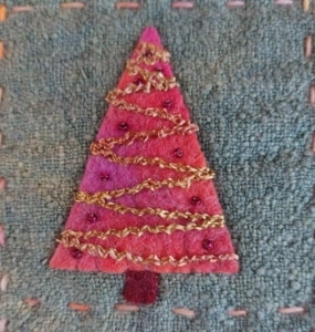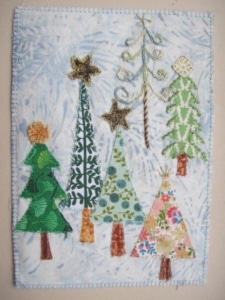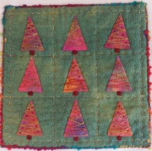 Ik was benieuwd of mijn mede bestuursleden ook ‘last’ hadden van kerstkriebels. Tot mijn verbazing was dat niet zo al hadden ze bijna allemaal wel iets ‘kersterigs’ gemaakt. Sylvia maakte geen quilt maar een kaart. Ze is ook niet van plan om ooit een kerstquilt te maken. Conny heeft niet zoveel met kerst maar wel met samenzijn en dat kan het hele jaar door. Toch viert ze elk jaar samen met broer en schoonzus de feestdagen met een gezamenlijk diner. Het echte samenzijn kan vaak pas in januari. Dan is het hele gezin compleet en vieren ze een uitgestelde kerst- en nieuwjaarslunch met elkaar. Een kerstquilt heeft ook zij niet gemaakt maar wel een paar “kersterige” werkjes tijdens workshops. In de boom krijgen hier en daar een paar zelfgemaakte vriendjes een plekje. Marjolein houdt het klein, haar kerstquiltje zou mee kunnen doen met de tentoonstelling van miniatuurquilts. Een nine-patch met negen kleine boompjes, elk met een andere versiering.