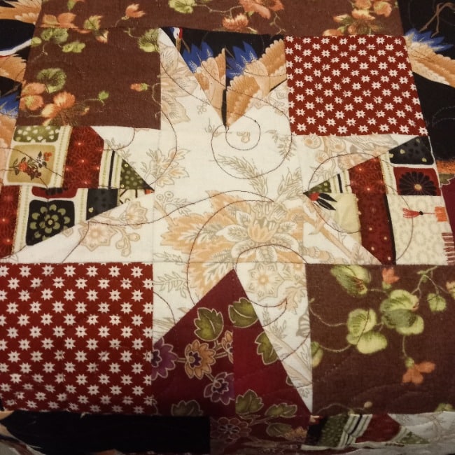 Yvonne maakte wel een kerstquilt waarbij ze opmerkte dat dit de eerste en ook enige is. Ze maakte haar ‘ronde, stralende ster’ jaren geleden in Amersfoort bij Laura Strating. Kleine zilveren sterren schitteren op een zwarte achtergrond. In de punten zijn kerststofjes verwerkt met hulsttakjes en roodborstjes. Het werk is gemaakt door stroken aan elkaar te naaien en die onder een hoek te versnijden en verspringend aan elkaar te zetten. De cirkel werd op de machine met gouddraad doorgestikt. Dit geeft het effect van stralen. De quilt is inmiddels oud en verschoten van kleur maar het blijft een van Yvonne’s favorieten. De tweede quilt die Pauline ooit maakte, gebruikt zij als kerstquilt. Het was destijds een hele goede oefening om puntjes te leren naaien. De inspiratie haalde ze uit een tijdschrift met alleen sterrenpatronen. De quilt ligt over de slaapbank te wachten op de logees die met kerst komen.