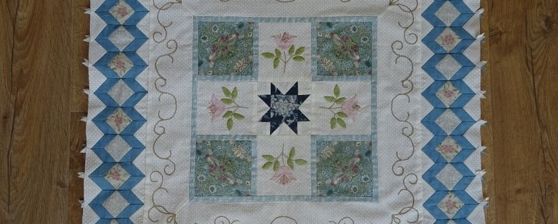 Afgelopen oktober startte ik met mijn nieuwe Quiltcursus. Ik kon kiezen tussen een Kaleidoscoop quilt of een Medaillon quilt. Maar een Kaleidoscoop quilt had ik al gemaakt, dus dat was een makkelijke keuze. Het werd een medaillon quilt! Maar dan, welke Medaillon quilt zou ik gaan maken? De keuze is eindeloos… en de beslissing is belangrijk. Ik ben immers wel een jaar met zo’n quilt bezig en daarna moet ik er ook nog zoveel jaar tegenaan kijken… Ik bekeek Pinterest, ik bekeek al mijn quilt bladen, de docent kwam met tips en een voorbeeld. Na wikken en wegen, afstrepen en afwegen, bleven er twee quilts over: Bathwick van Karen Styles en Piney Rose van Cindy Blackberg, allebei als patroon gepubliceerd in Quiltmania. Uiteindelijk besloot ik Bathwick te maken. Maar dan wel met een eigen draai eraan en met gebruik van het borduurwerk uit de quilt Piney Rose.