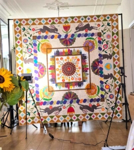 Omdat de quilt zo groot is (241cmx241), heb ik erg veel moeite moeten doen om een beetje normale foto’s te kunnen maken. Ik heb een groot statief met voldoende vrije ruimte voor zo’n bakbeest. Gelukkig heb ik ook een huis met een hoog plafond dus kan ik goed de hoogte in. Ik heb ook losse LED verlichting om de quilt te verlichten. Wat ik mis is een goede camera. Maar ach, je kan niet alles hebben toch? En die telefoons van tegenwoordig komen een heel eind. Toch blijft het bijzonder lastig om de quilt in z’n geheel goed in beeld te krijgen. Ik moest wel erg lachen toen ik even afstand nam en zag hoe mijn huiskamer er bij stond. Ook maar een plaatje van ‘achter de schermen’ dan: