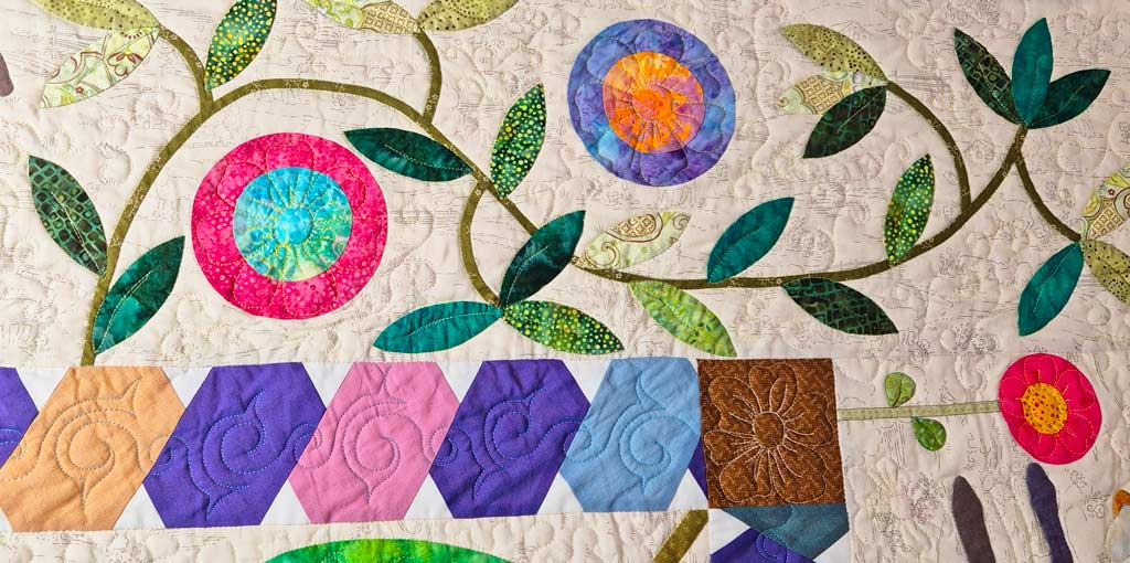 In april had ik in Rijswijk bij de Patchwork en Quiltdagen nog wat ander garen uitgezocht om mee te experimenteren. Ik heb eigenlijk altijd met katoenen garen gewerkt (Aurifil heeft mijn voorkeur), maar zag al een tijdje steeds meer berichten over polyester glansgarens die het fantastisch doen bij doorquilten. Ik heb wat vrolijke kleuren uitgezocht van het merk Glide en ook nog een mooi subtiel verlopend garen van Wonderfil. En beide merken zijn mij uitstekend bevallen. Het quilten ging soepeltjes, zonder enig gedoe en het resultaat op de stof is ook fantastisch. Okay, je moet er wel met je neus bovenop zitten om het te zien. Maar dat doen wij quilters ook graag, toch?