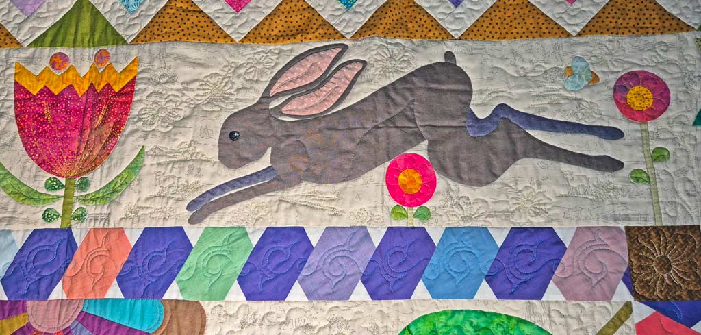 Bij het schrijven van dit blogje kwam ik erachter dat ik – niet geheel onverwacht – het woord ‘AFFO’ al regelmatig heb gebruikt in titels van stukjes. Dit keer dus een keer iets anders: hij is klaar! Mocht je mijn blogjes al een tijdje volgen, dan heb je deze quilt al vanaf 2017 regelmatig voorbij zien komen. Wat zeg ik: vorige blogje zelfs nog uitgebreid, kijk maar hier. Maar nu is hij dan eindelijk klaar. Die zo enorm grote, kleurige, zelfs zomerse quilt: mijn Down the Rabbit Hole (patroon van Sarah Fielke).