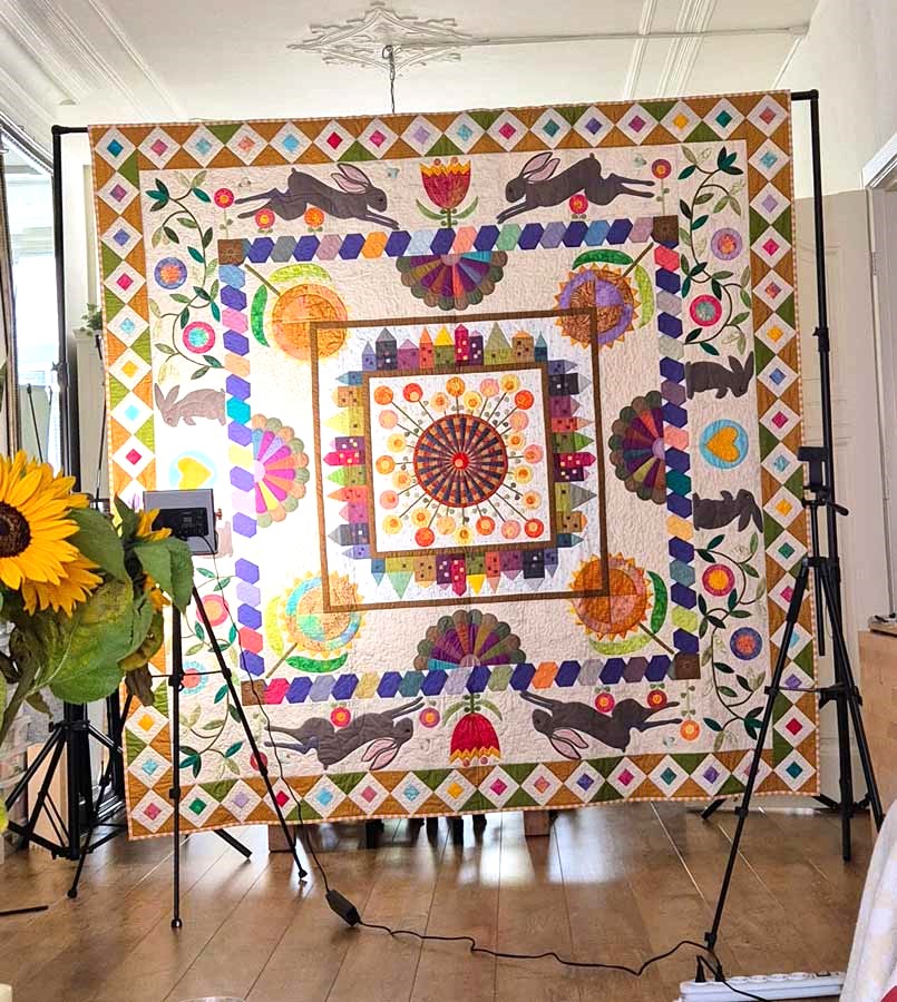 Er ontbreekt alleen nog een label. Ik wil nog een leuk ontwerp maken voor de borduurmachine om in het label te verwerken. Dat is weer een leuk klusje voor in de zomervakantie. Daar komt in ieder geval op te staan dat ik er van 2017-2024 aan heb gewerkt, dat het patroon van Sarah Fielke is en dat ik ‘m met de hand heb geappliqueerd en verder met de machine in elkaar heb gezet en doorgequilt. Zo, en dan is ‘ie klaar!
