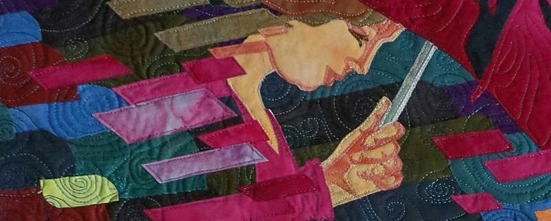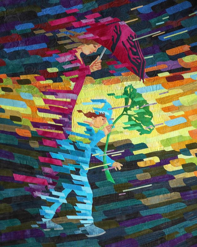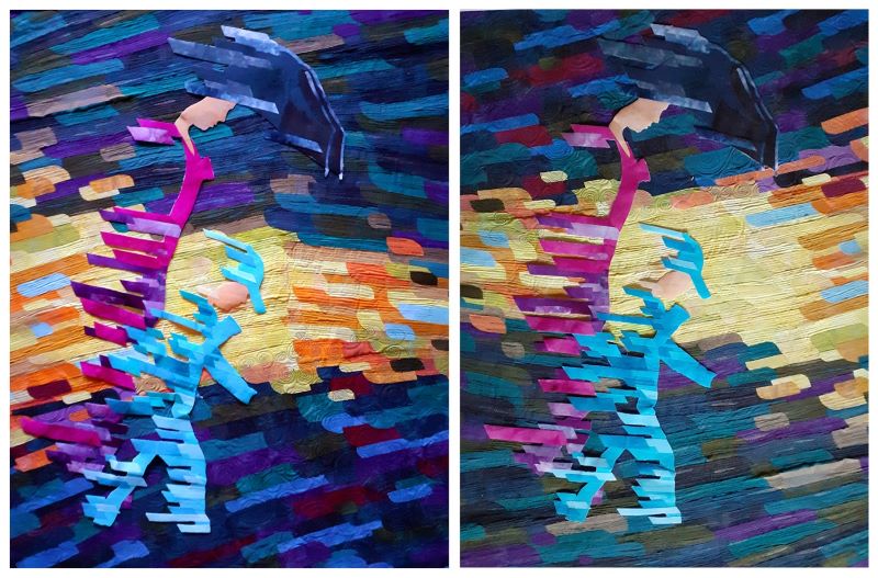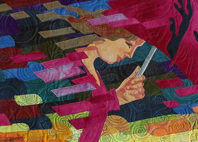 De figuren zijn vast gestikt langs de rand om het contrast naar de zwaar doorgestikte ondergrond sterker te maken en zo is het toch nog een werk geworden waar ik met plezier naar zal kijken. Wat mij betreft is de beweging goed in beeld gebracht, al zal het voor sommigen te ver zijn doorgevoerd. Degene die goed kijkt ziet bijvoorbeeld dat de vrouw geen benen heeft maar die stoorden en zijn niet nodig, je hoofd bedenkt ze er wel bij.