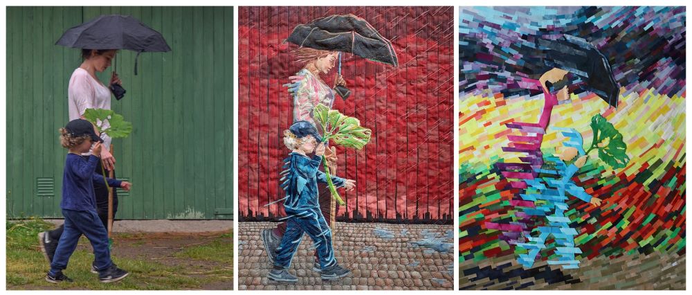 Nadat de beslissing was gevallen kon ik de figuurtjes verder uitbouwen, de paraplu vervangen omdat die weg liep in de achtergrond en als laatste nog enkele regendruppels toevoegen. Bij de grote paraplu gaan de druppels niet verder, de vrouw blijft droog maar bij de jongen komen de druppels door zijn “paraplu” heen en hij wordt dus nat.