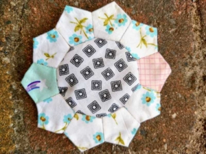 Na wat denkwerk en combineren van elementen kreeg ik een idee. Ik ontwikkelde de vlieseline-mozaïek-methode. Het mooie is dat het met elk EPP patroon kan, wat je koopt of zelf tekent. Ik teken in EQ8, maar dat is niet noodzakelijk. Het enige wat je nodig hebt, is een totaal overzicht van de afbeelding in werkelijk formaat.