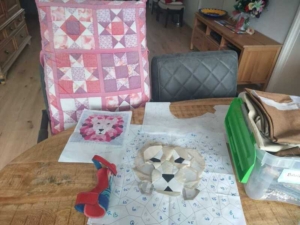 De vlieseline versie bleef zoveel mogelijk als 1 geheel bij elkaar. Ik kon steeds het gemaakte deel (in de vlieseline versie) op de papieren versie bekijken. Dit was erg prettig. Zeker ook omdat ik er geen richtingpijltjes had bij gezet. Ik heb heel wat gepuzzeld, gepast en af en toe uitgehaald.