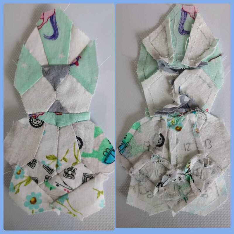 Ik koos de eerste 10 stukjes in de neus-bek hoek. Van onderaf knipte ik op de lijnen naar de neus-bek hoek en knipte deze uit. Ik knipte de vlieseline-mozaïek stukjes van elkaar en sorteerde ze op kleur. Ik streek de stukjes op de stofjes (let er op dat het goed vastzit) en knipte ze met een naad uit. Stofjes weer opvouwen en terug in de bak.