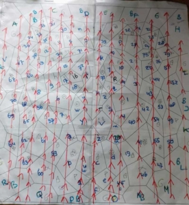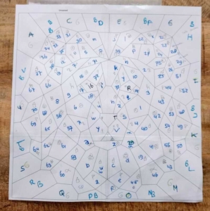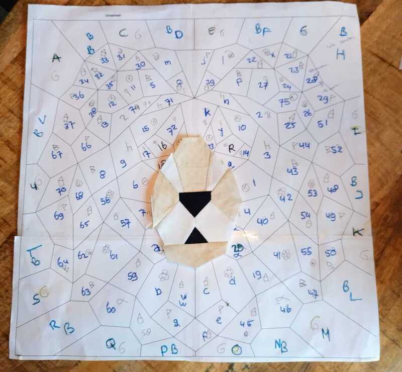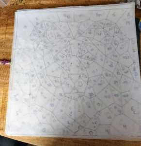 Teken op dit papieren patroon codes voor de verschillende stofjes. Geef alle mozaïek stukjes een nummer. Ik heb in dit voorbeeld met verschillende soorten nummering gewerkt, onnodig.