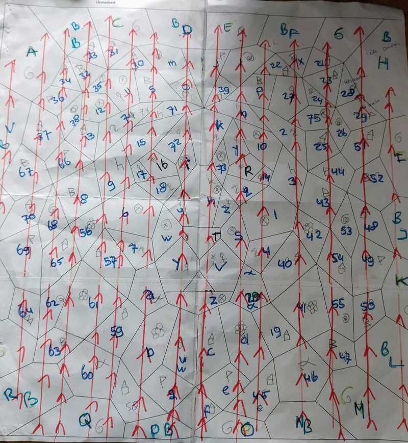 Bij het overtrekken kan het gebruik van een (eenvoudige) lichtbak handig zijn. Neem eerst het patroon (mozaïek contouren) over. Met het gebruik van een liniaal kun je mooie, strakke lijnen overtrekken. Schrijf/teken alle nummers, codes en richtingspijlen in de mozaïek stukjes over.
