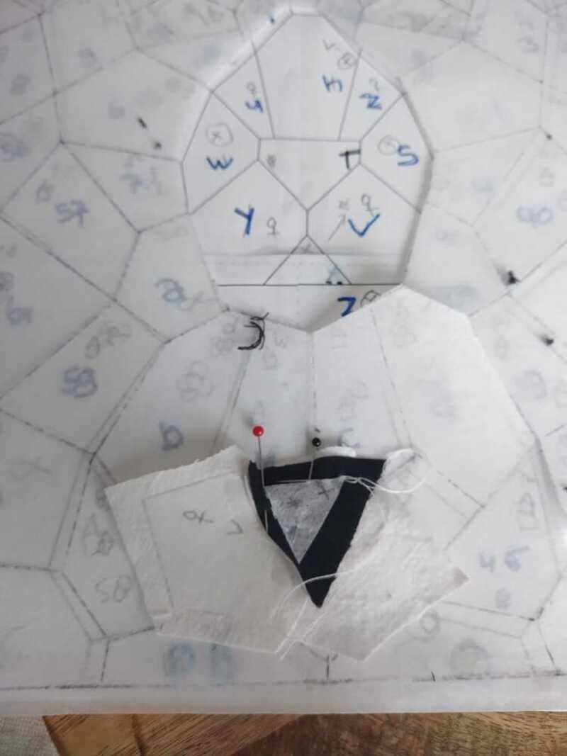 In gedachten ‘vloeiende lijnen houden’ met naaien helpt mij om de volgorde van naaien te bepalen. Zo zette ik de 10 stukjes aan elkaar. Tot slot legde ik het genaaide deel in het vlieseline deel op het papieren patroon.