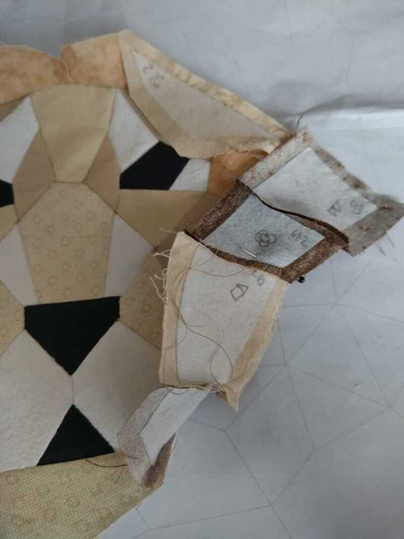 De vlieseline versie bleef zoveel mogelijk als 1 geheel bij elkaar. Ik kon steeds het gemaakte deel (in de vlieseline versie) op de papieren versie bekijken. Dit was erg prettig. Zeker ook omdat ik er geen richtingpijltjes had bij gezet. Ik heb heel wat gepuzzeld, gepast en af en toe uitgehaald.