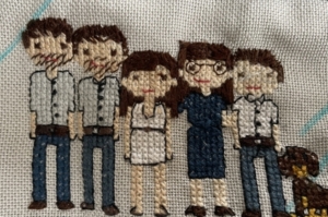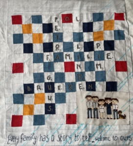 Nu moest ons gezin er nog op komen… mmm…ik vond op Pinterest cross stich family…dat was leuk er werden hele gezinnen geborduurd…daar ben ik mee aan de slag gegaan…ik heb het gezin getekend en toen geborduurd… hoe goed ik vroeger ook kon borduren, hoe slecht gaat dat mij nu af…ik zie het gewoon niet…zo jammer… zet toch door…ik leg de borduurstof op mijn quiltstof en ga aan de slag…en toen was het klaar…op de draadjes van de borduurstof er uit trekken na…neeeeee…het lukt niet, wat nu…ongelooflijk, zo vast als een huis, het was gewoon niet mooi meer…wat dan nu…alles voor niets… begin ik dan opnieuw?