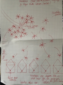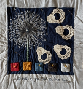 Ik wilde een donkere ondergrond en daarop een “dandelion” maken…zo’n paardebloembol die je uit kunt blazen…en als je dan blaast dan waaien al die zaadjes zo mooi weg…op weg van de oude bloem naar nieuw leven…dat vind ik een fijn en mooi idee… dat er iets van iemand achter blijft… en dat is vaak ook wel, qua uiterlijk, een karaktertrek…iedereen zegt wel eens…die lijkt precies op…of dat deed opa ook altijd…zo gaat dat generaties door… van oud naar nieuw leven. Voor mij is de Dandelion een mooi voorbeeld daarvan…
