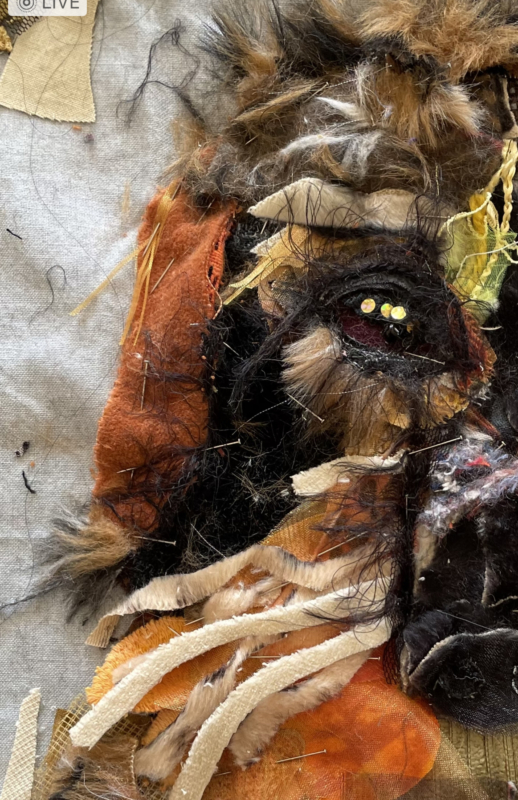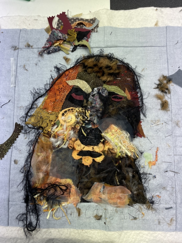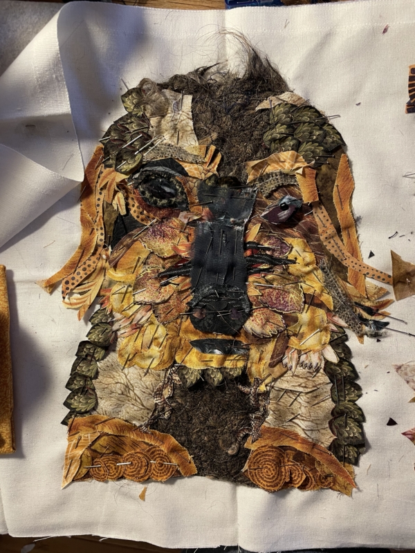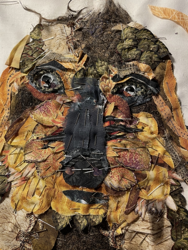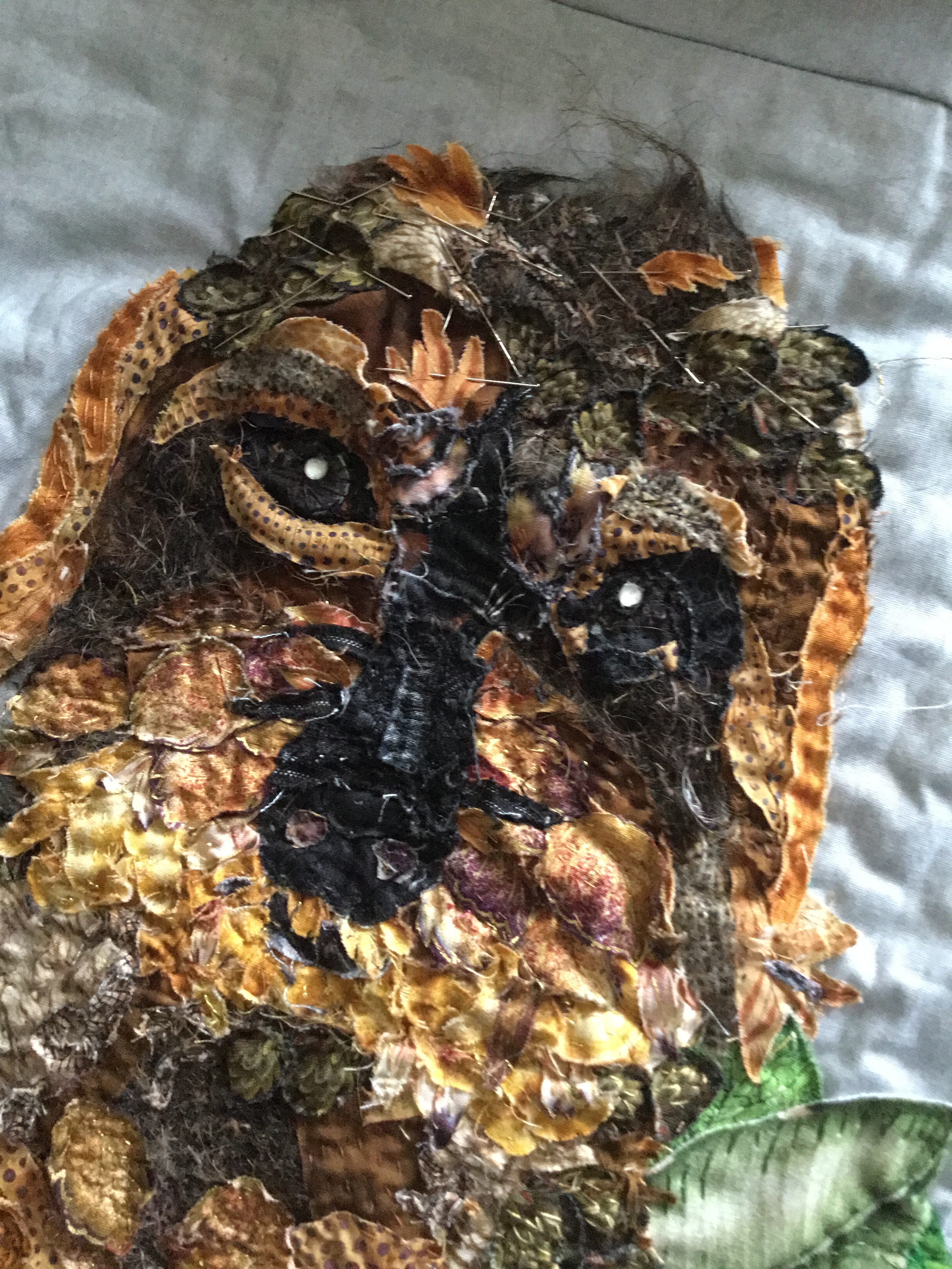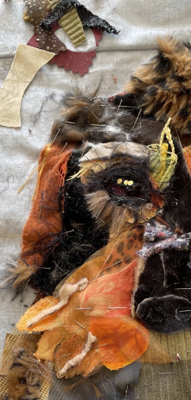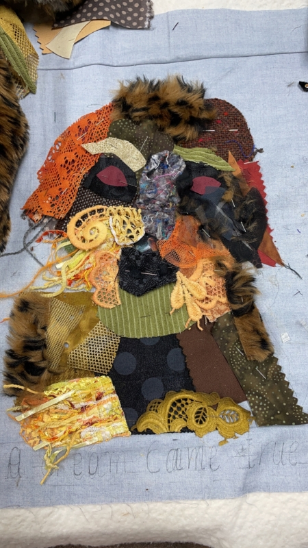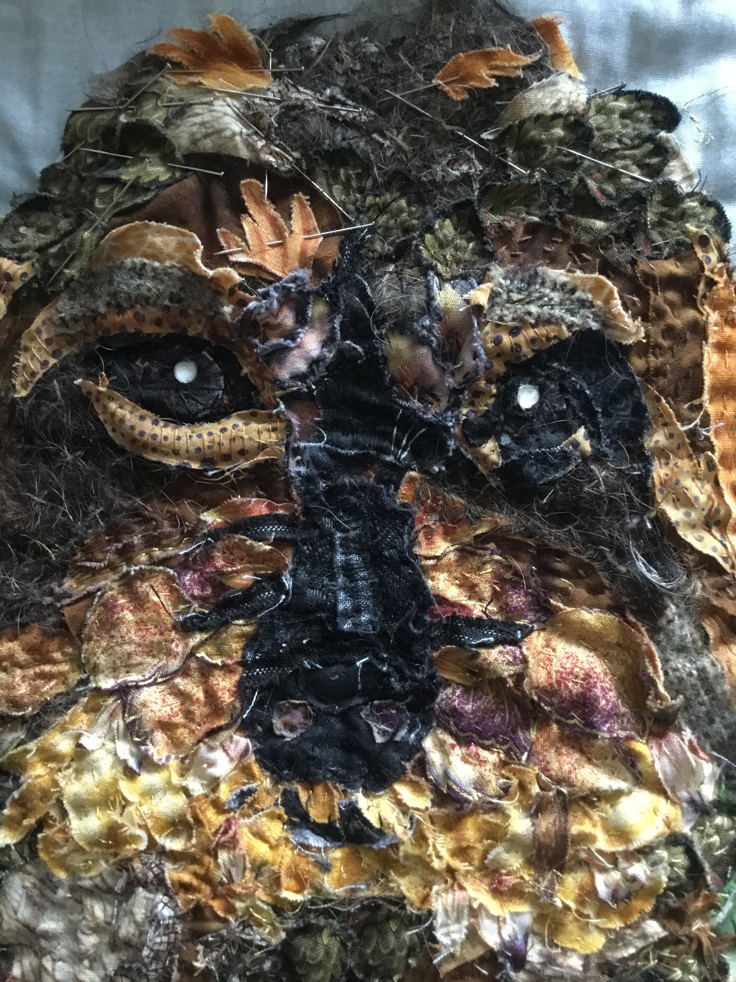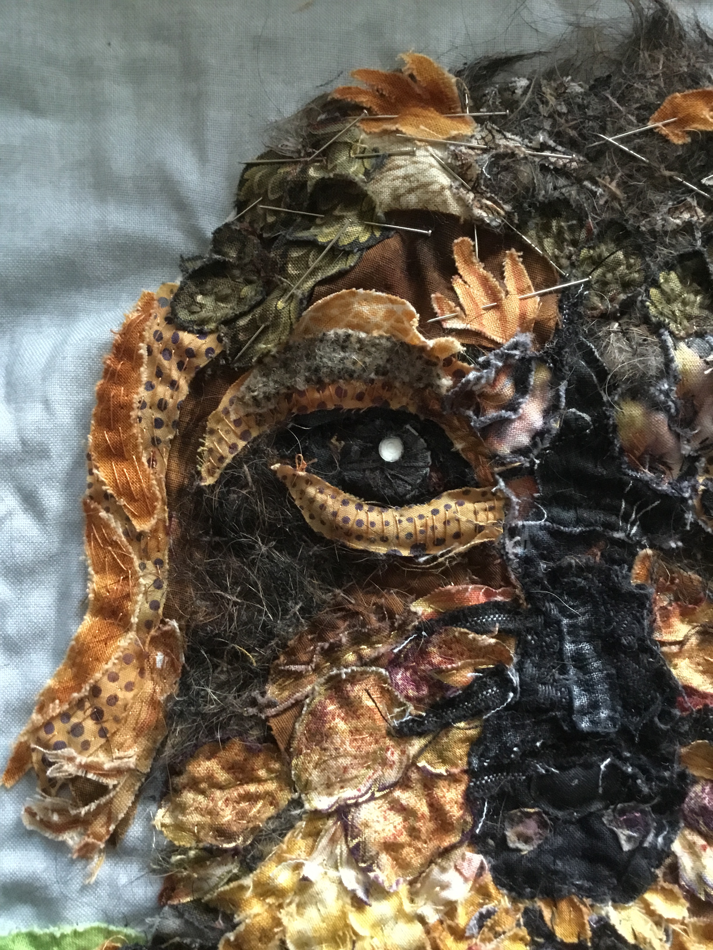 opnieuw aan de slag…daar ging ik weer, stofjes knippen en knippen, nu kan ik meer in stofjes zien dan ooit… een bloemblaadje was opeens een bosje haren… maar ogen…zo ontzettend moeilijk voordat je daar iets van gemaakt hebt…uren en uren… maar ben tevreden…
