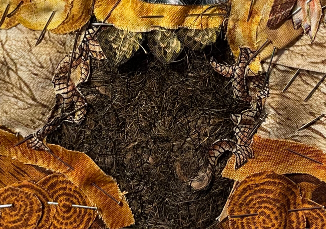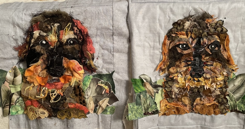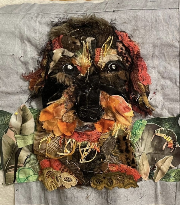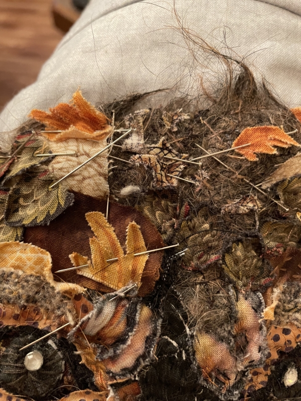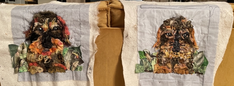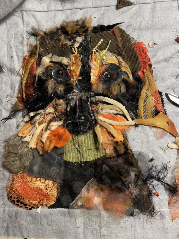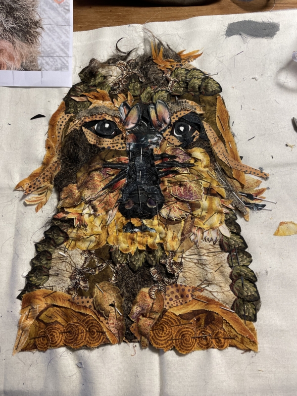 En er komt ook nog wat echts… Bobbus was naar de trimmer geweest en er kwam allemaal haar mee terug… ik dacht wat zal ik daar mee doen, ik heb het gewassen, laten drogen en toen op soluvlies gestikt, onder de kraan gehouden en toen had ik stof van haar eigen haar…ohh, een echt stukje Bobbus in mijn quilt…een stukje die nooit vergaat…