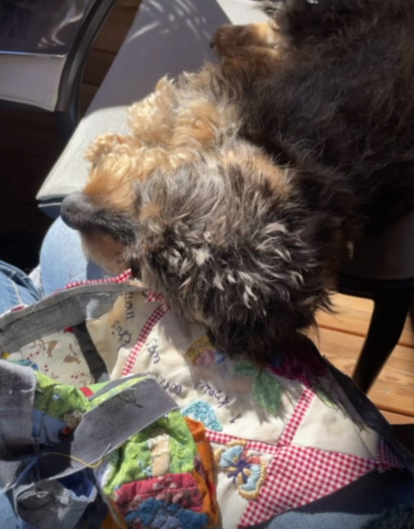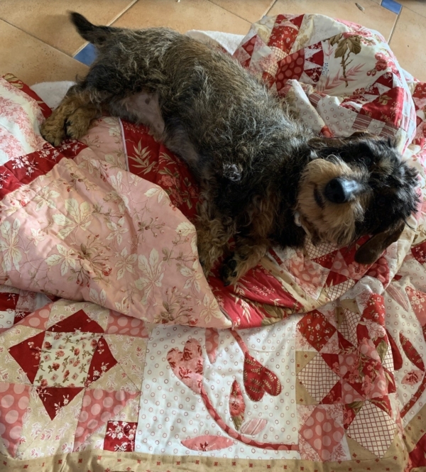Helaas is onze Bobbus veel te vroeg…op 9 jarige leeftijd overleden..zij, die altijd op de quilt kwam liggen of bij je lapjes…als ze maar in je buurt was, een geweldige, lieve, bijzondere vriendin…een droom die uitkwam en die ik helaas moest los laten…gelukkig nog het blok van van haar te genieten met haar van haarzelf erin…