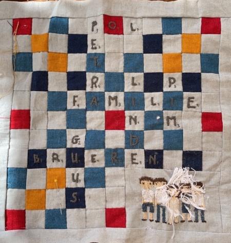 Nu moest ons gezin er nog op komen… mmm…ik vond op Pinterest cross stich family…dat was leuk er werden hele gezinnen geborduurd…daar ben ik mee aan de slag gegaan…ik heb het gezin getekend en toen geborduurd… hoe goed ik vroeger ook kon borduren, hoe slecht gaat dat mij nu af…ik zie het gewoon niet…zo jammer… zet toch door…ik leg de borduurstof op mijn quiltstof en ga aan de slag…en toen was het klaar…op de draadjes van de borduurstof er uit trekken na…neeeeee…het lukt niet, wat nu…ongelooflijk, zo vast als een huis, het was gewoon niet mooi meer…wat dan nu…alles voor niets… begin ik dan opnieuw?