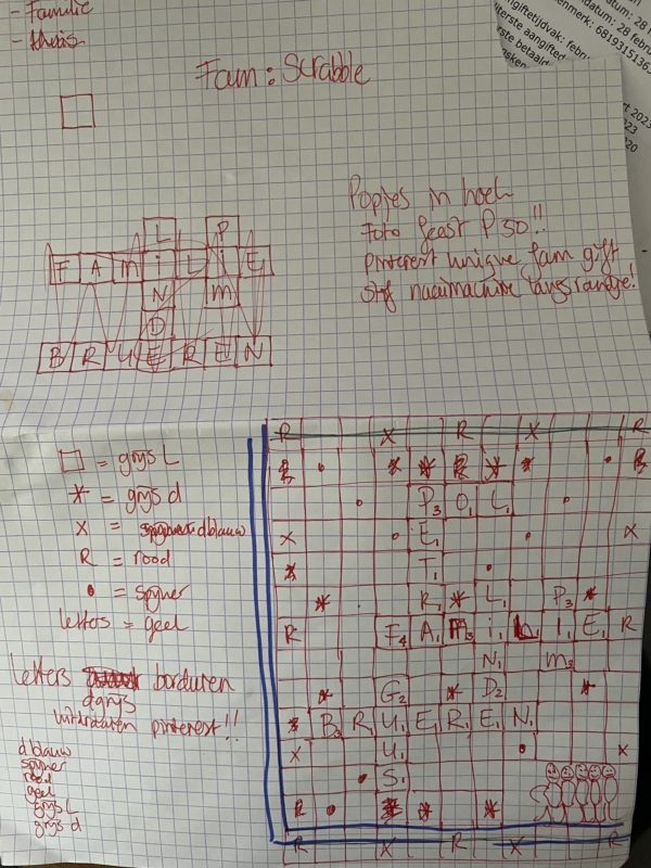 Het wordt dus een scrabble blok waar al onze namen van het gezin op kwamen te staan..mijn familie…de vakjes ging ik maken van verschillende kleuren net als een scrabble bord, de letters moesten cijfers hoeveel punten ze waard zijn…en puzzelen maar hoe de namen in elkaar over konden vloeien, eigenlijk ging het vanzelf…wat hebben we die namen dan toch mooi bedacht vroeger ;)
