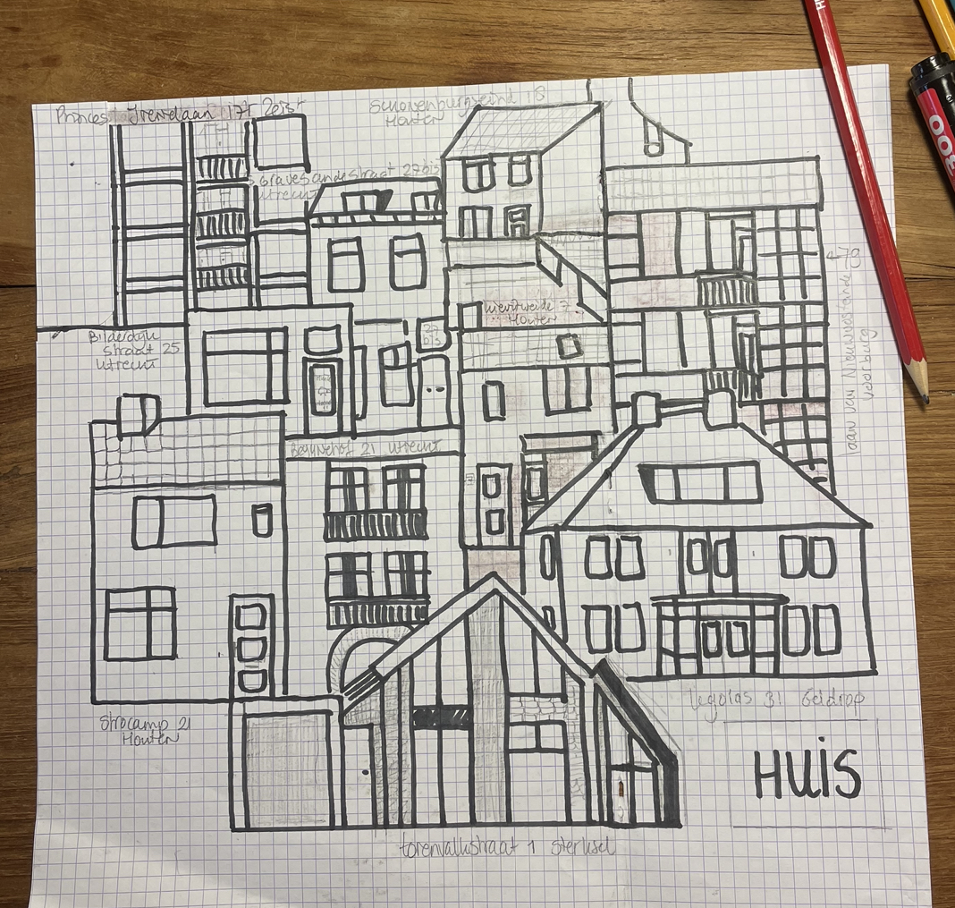 Nu had ik van alle huizen een tekening, maar dan heb je ze nog niet bij elkaar…