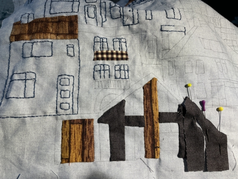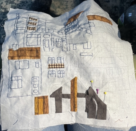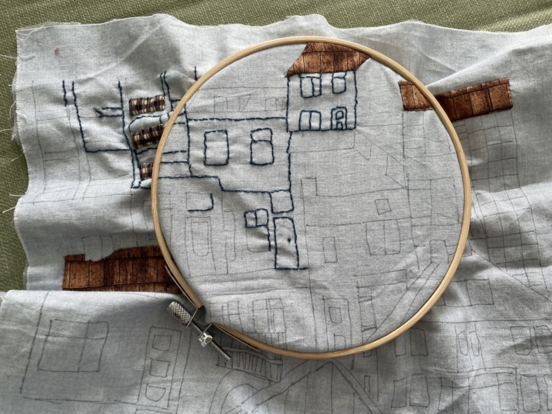En borduren maar…IK wilde niet alleen borduren maar ook balkonnetjes en daken… en het nog te bouwen huis in stof op de voorgrond… daar gaan we dan…