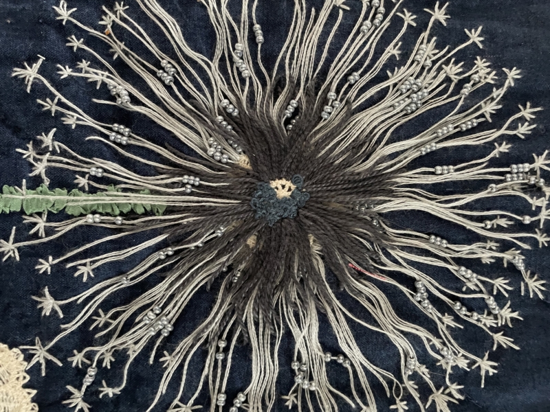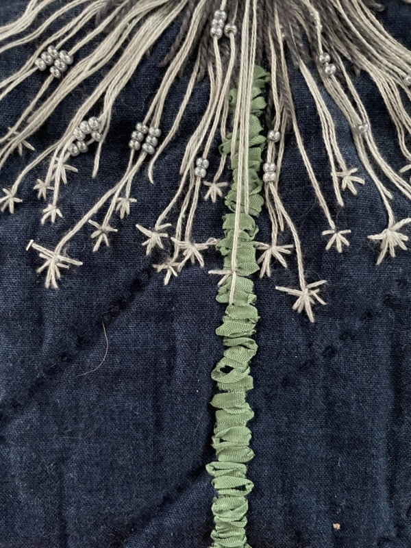 Ik wilde een donkere ondergrond en daarop een “dandelion” maken…zo’n paardebloembol die je uit kunt blazen…en als je dan blaast dan waaien al die zaadjes zo mooi weg…op weg van de oude bloem naar nieuw leven…dat vind ik een fijn en mooi idee… dat er iets van iemand achter blijft… en dat is vaak ook wel, qua uiterlijk, een karaktertrek…iedereen zegt wel eens…die lijkt precies op…of dat deed opa ook altijd…zo gaat dat generaties door… van oud naar nieuw leven. Voor mij is de Dandelion een mooi voorbeeld daarvan…