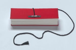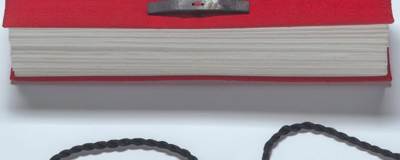 Aan beide uiteinden is van karton, beplakt met dunne tussenvulling en rode zijde, een kaft gemaakt.