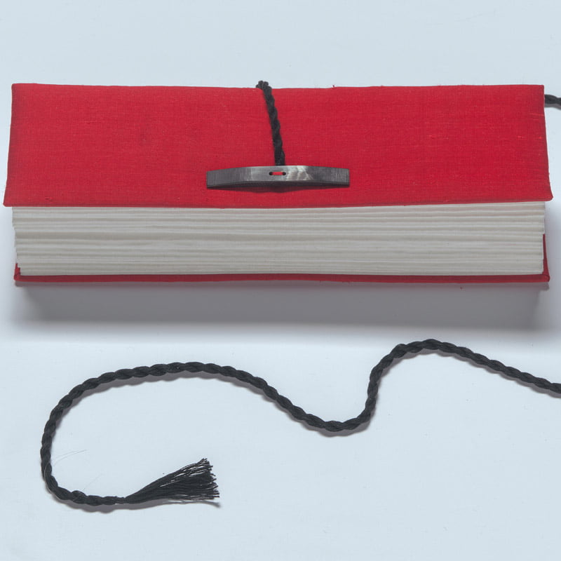 Aan beide uiteinden is van karton, beplakt met dunne tussenvulling en rode zijde, een kaft gemaakt.