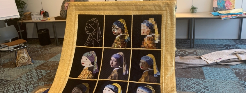 Superleuk, wist je dat ze de eerste longarmquilter in Nederland was (en de tweede in Europa) en dan hebben we het over 1 januari 2000. Niks geautomatiseerde patronen quilten, alles ging op een houtjetouwtje manier. Maar ze durfde het aan en kijk waar ze nu staat. Ze bracht een berg quilts mee, werk gemaakt aan de hand van thema’s, familie herinneringsquilts, wedstrijdquilts, en allemaal even fraai gequilt natuurlijk…