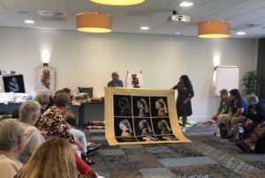 De trunkshow van Elly Prins was heel leerzaam. “Je komt met een hoofd boordevol ideeën naar buiten” zei een van de deelnemers. Naast de verhalen over de diverse quilts vertelde Elly ook over tussenvullingen, garens en quiltpatronen.