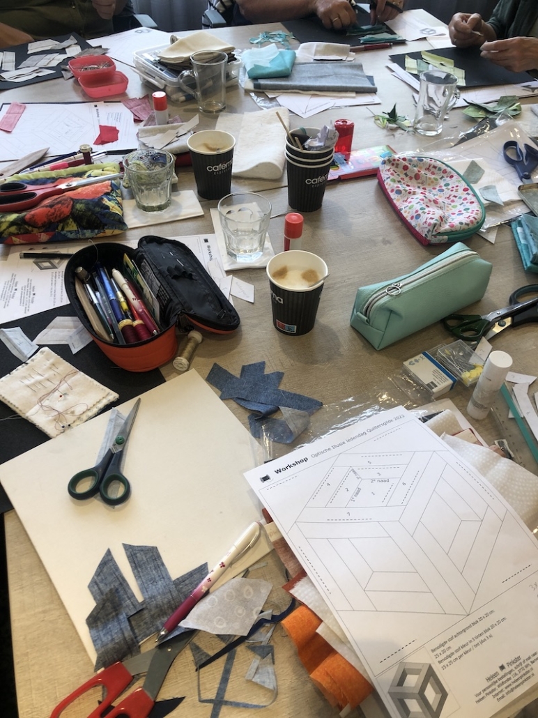Bij de workshop van Heleen Pinkster was het heeeeel stil. Iedereen was geconcentreerd bezig met het uitwerken en begrijpen van het 3-D patroon. Bij sommigen viel het kwartje eerder dan bij anderen, maar Heleen nam de tijd om iedereen duidelijke uitleg te geven. Petje af voor Heleen!